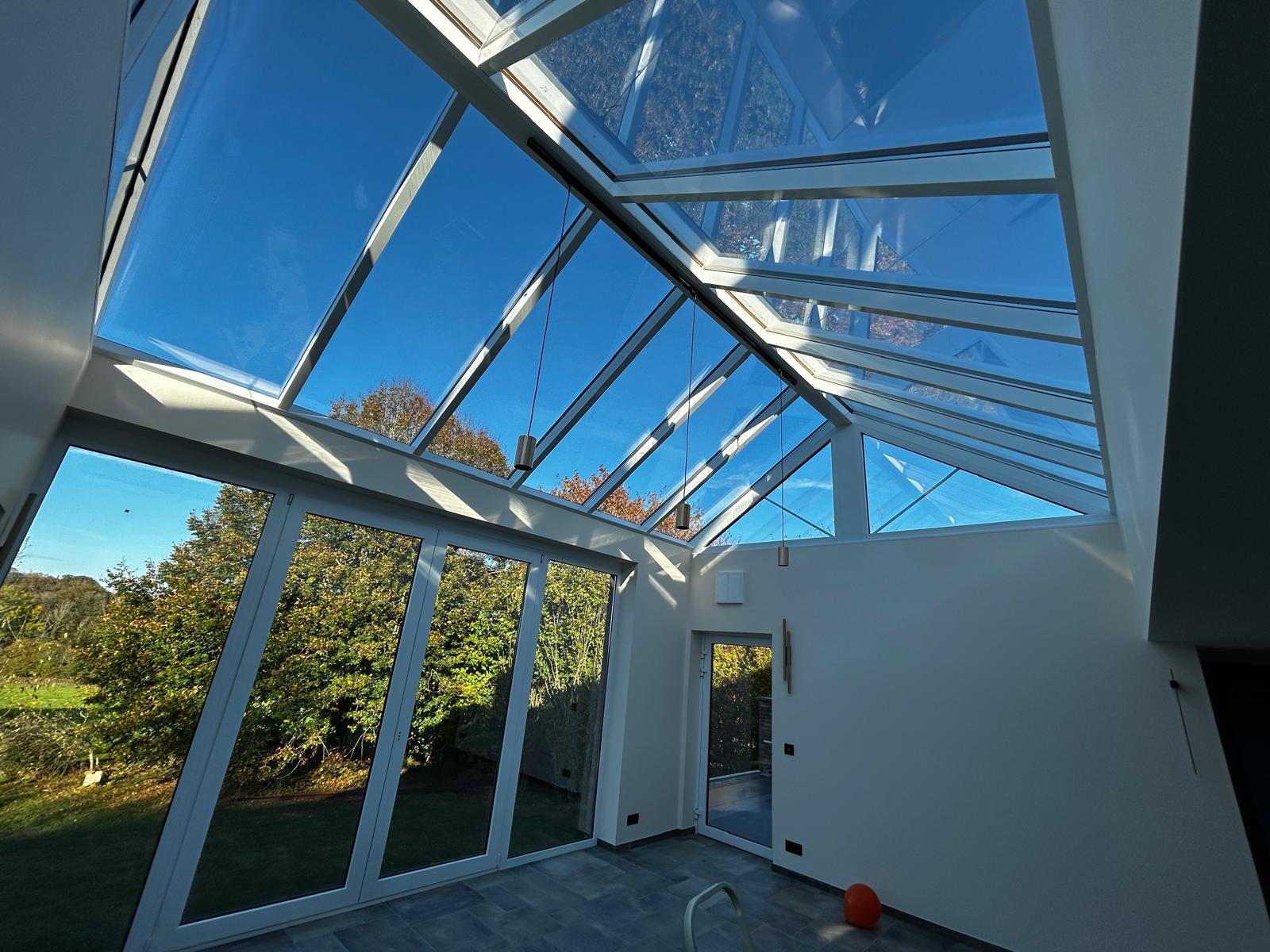APRÈSVue interieure veranda avec toit verriere et grandes baies vitrees