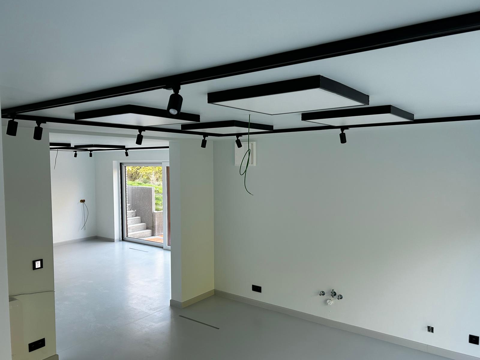 APRÈSSalon avec faux plafond noir, spots LED et sol en resine grise