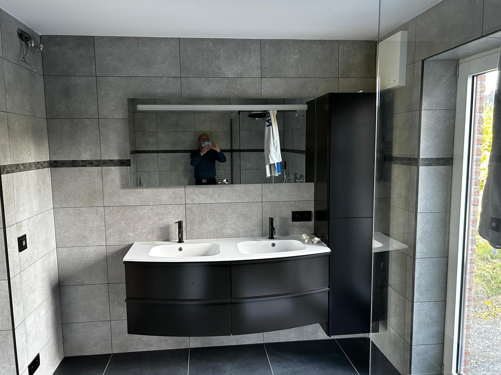 APRÈSSalle de bain terminee avec double vasque, colonne et carrelage gris